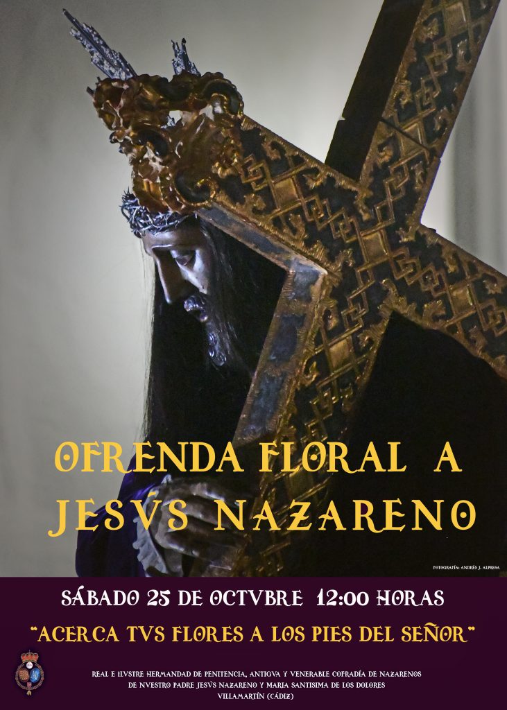 Una iniciativa que parte del grupo joven de la Hermandad y Cofradía y que se han prestado a realizar una ofrenda floral a su Venerado Titular, Nuestro Padre Jesús Nazareno, Para ello estarán en Santa María de las Virtudes el próximo sábado 25 de octubre a partir de las 11:30 horas de la mañana a fin de que a partir del rezo del «Angelus» todos aquellos hermanos, devotos, feligreses y otras hermandades que lo deseen puedan ofrecer a los pies del Señor un ramo de Flores,