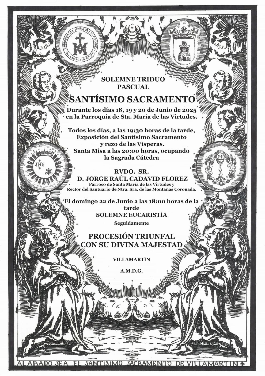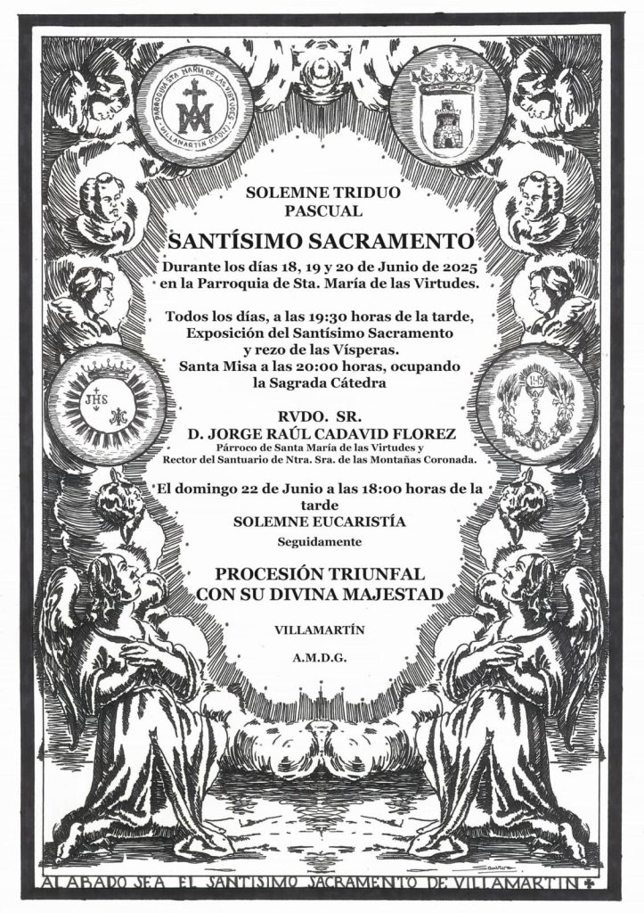 La Junta de Gobierno emplaza al general del Cuerpo de Hermanos de esta Hermandad y Cofradía a la asistencia y participación en el Solemne Triduo Pascual al Santísimo Sacramento, así como también les invita a participar en el montaje del Altar de Corpus Christi de la Hermandad la mañana del próximo día 22 de Junio.